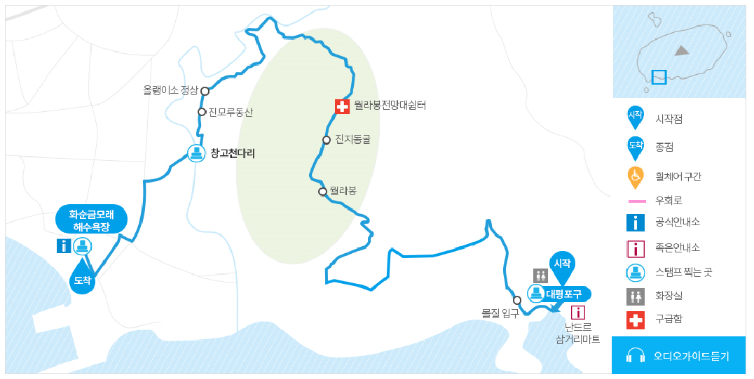 ⚫ 병풍바위인 박수기정을 배경으로 한 아담한 대평포구에서 시작해서 6km로 트레킹 길이가 짧아 시간도 3~4시간이 걸리지만, 제법 가파른 월라봉을 올라야 하는 난이도 “상”의 코스이다. 월라봉에 오르면 제주 남서쪽의 마을들과 바다가 한 눈에 들어온다. 지붕 낮은 집들과 돌담길 마늘밭, 감자밭이 정겹다.⚫ 천연기념물 377호로 지정된 안덕계곡의 울창한 나무 그늘을 지나서, 탁 트인 화순금모래해수욕장이 펼쳐진다.