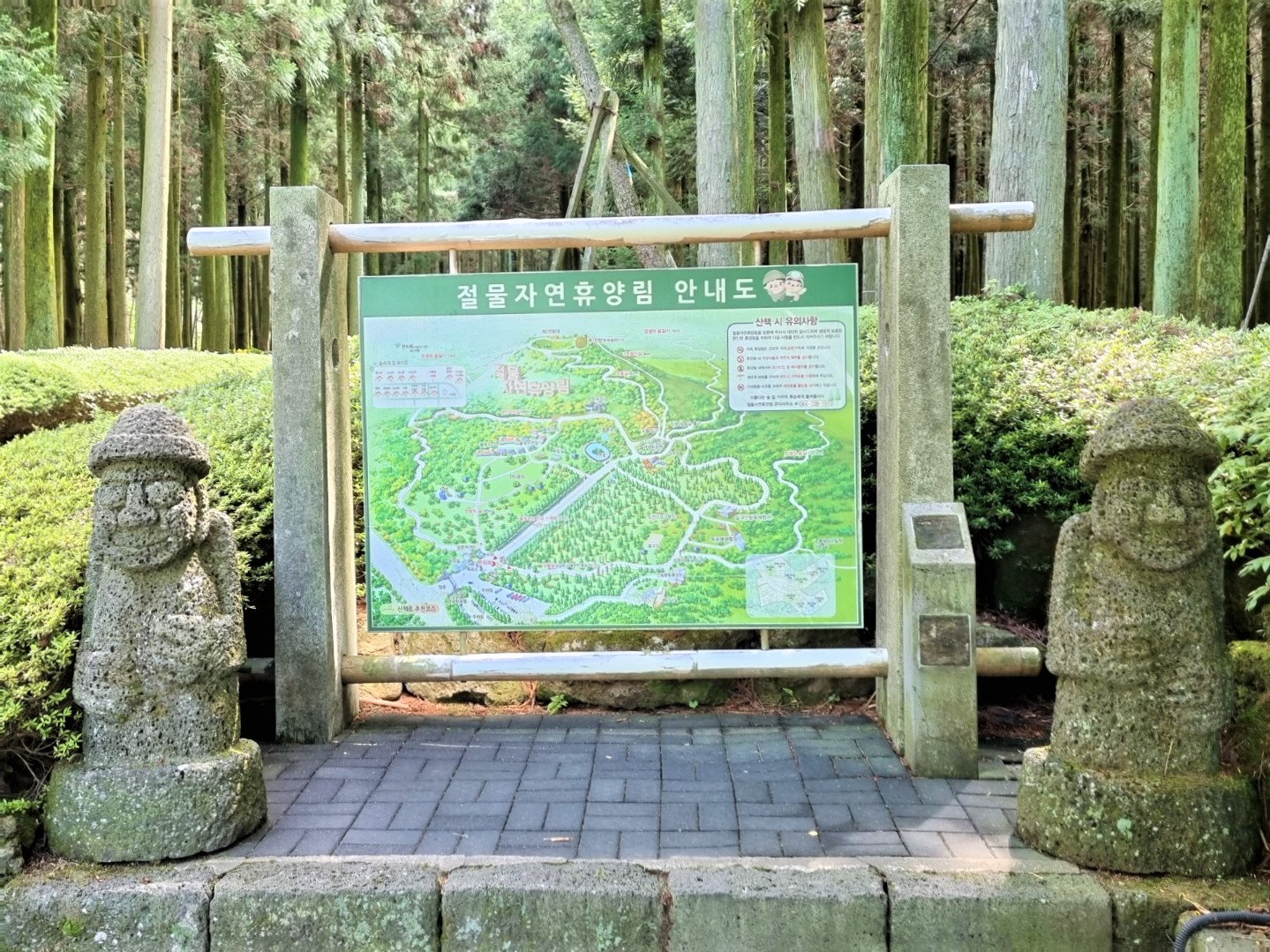 ⚫ 제주절물자연휴양림은 제주시 봉개동 절물오름 분화구 아래 1997년 7월 23일 개장한 곳으로 총 300ha의 면적에 50년생 삼나무가 빽빽하게 들어서 있다. ‘절물’이란 지명의 유래는 옛날 절 옆에 물이 있었다고 하여 붙여진 이름으로 현재 절은 없으나 약수암이 남아 있다.